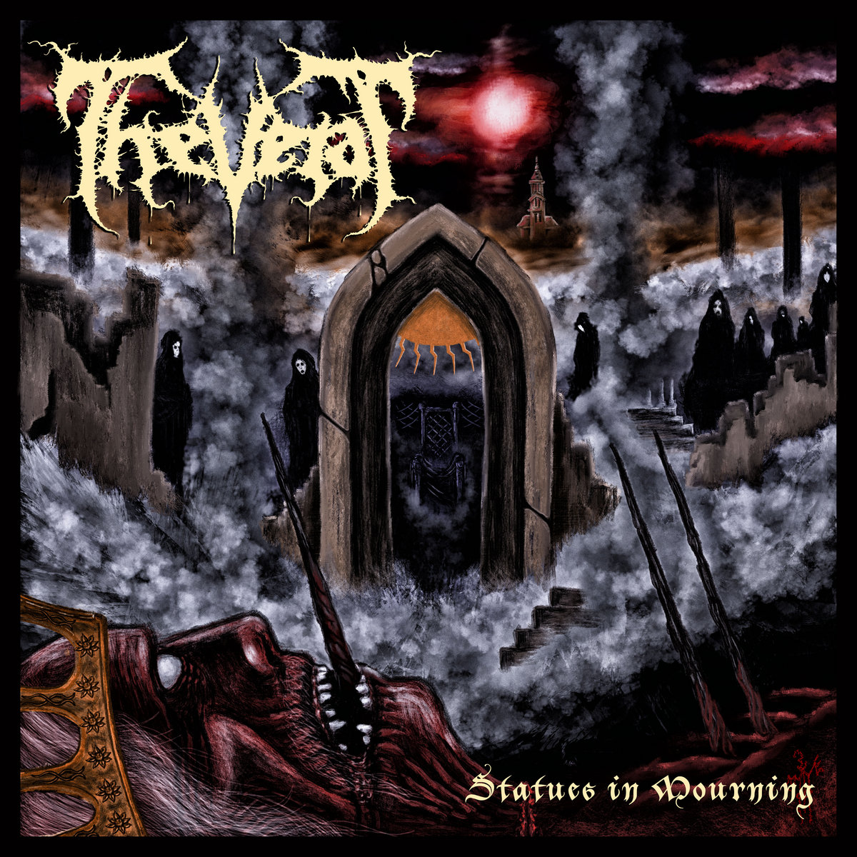 After five years Thevetat return to unleash total death on the single "Statues in Mourning." "Statues..." was the last recording by Thevetat before hiatus and unreleased until now. This is riff barrage from the depth of sullen shadow. Truly exciting to make raw putrid death metal how its meant to be. The culmination of variant creative time, and in doing so quarantine subsided, and details speak for itself.